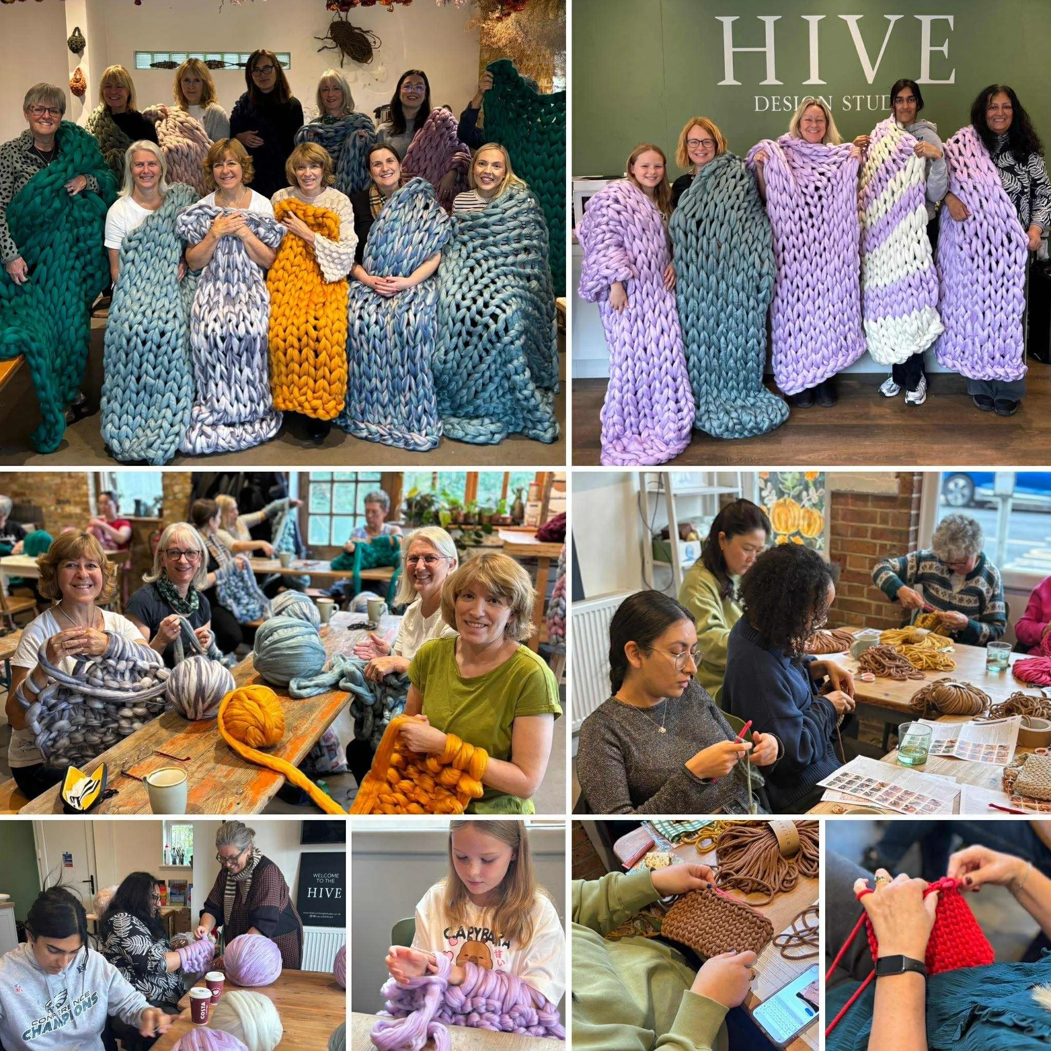 Last weekend was a whirlwind of creative energy! We held Arm Knit Blanket Workshops at Hive Design Studio in South London & at Pitfield Barn in Hurstpierpoint, & we were delighted to see so many enthusiastic makers join us. Our Arm Knitting sessions are as popular as ever, & it’s fantastic to keep welcoming new faces.
