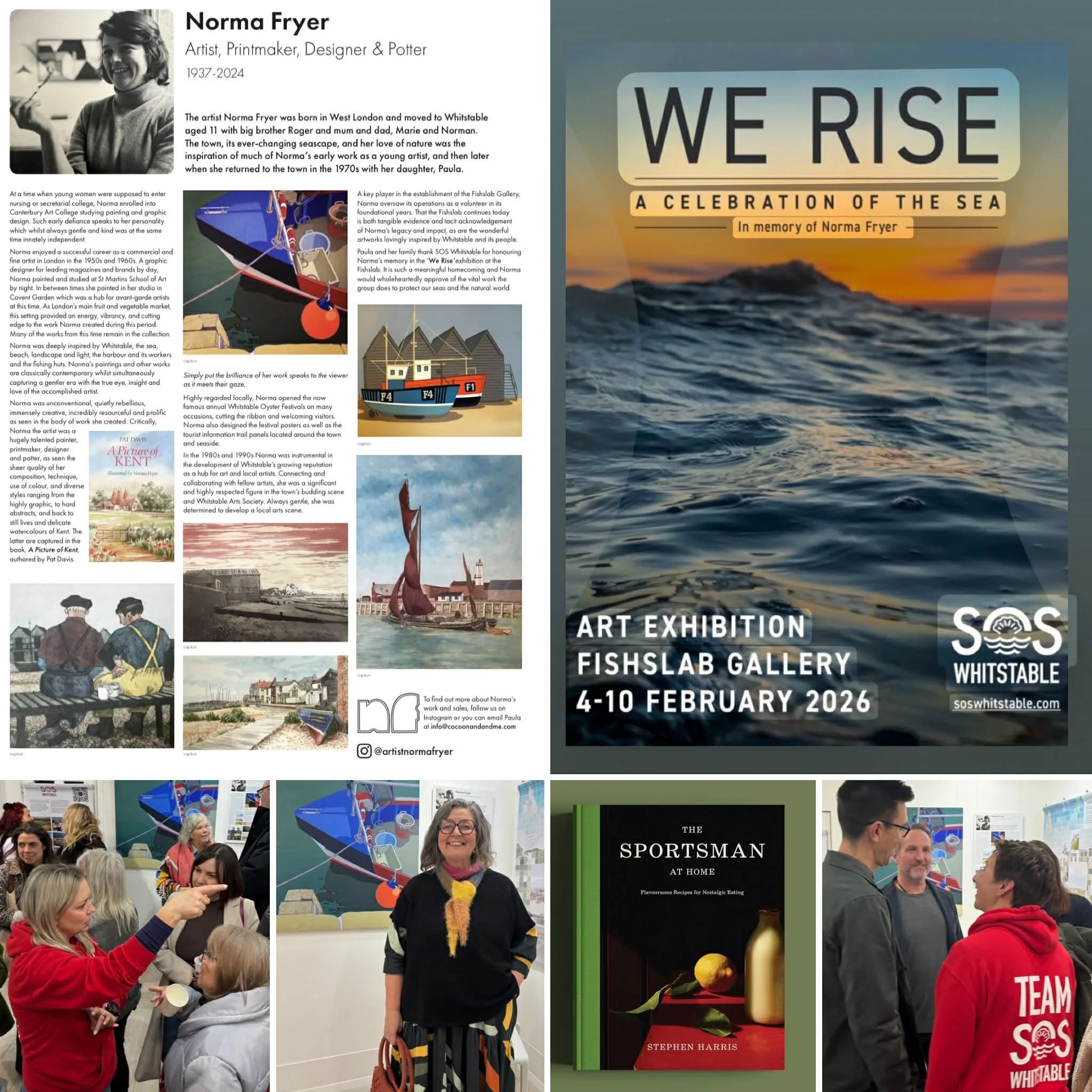 You may remember that two years ago, when Norma passed away, the family chose to honour her memory not with flowers but by raising money to donate to a local charity in Whitstable Kent, where Norma had spent most of her life. We managed to raise £1,000 which was very gratefully received by SOS Whitstable, a group founded by sea swimmers & now a small charity raising awareness of sea pollution. They have used part of the money for various projects, including last week’s exhibition held at the Fishslab gallery. Norma started & volunteered at this gallery, which allows local artists to exhibit & sell their work for free.