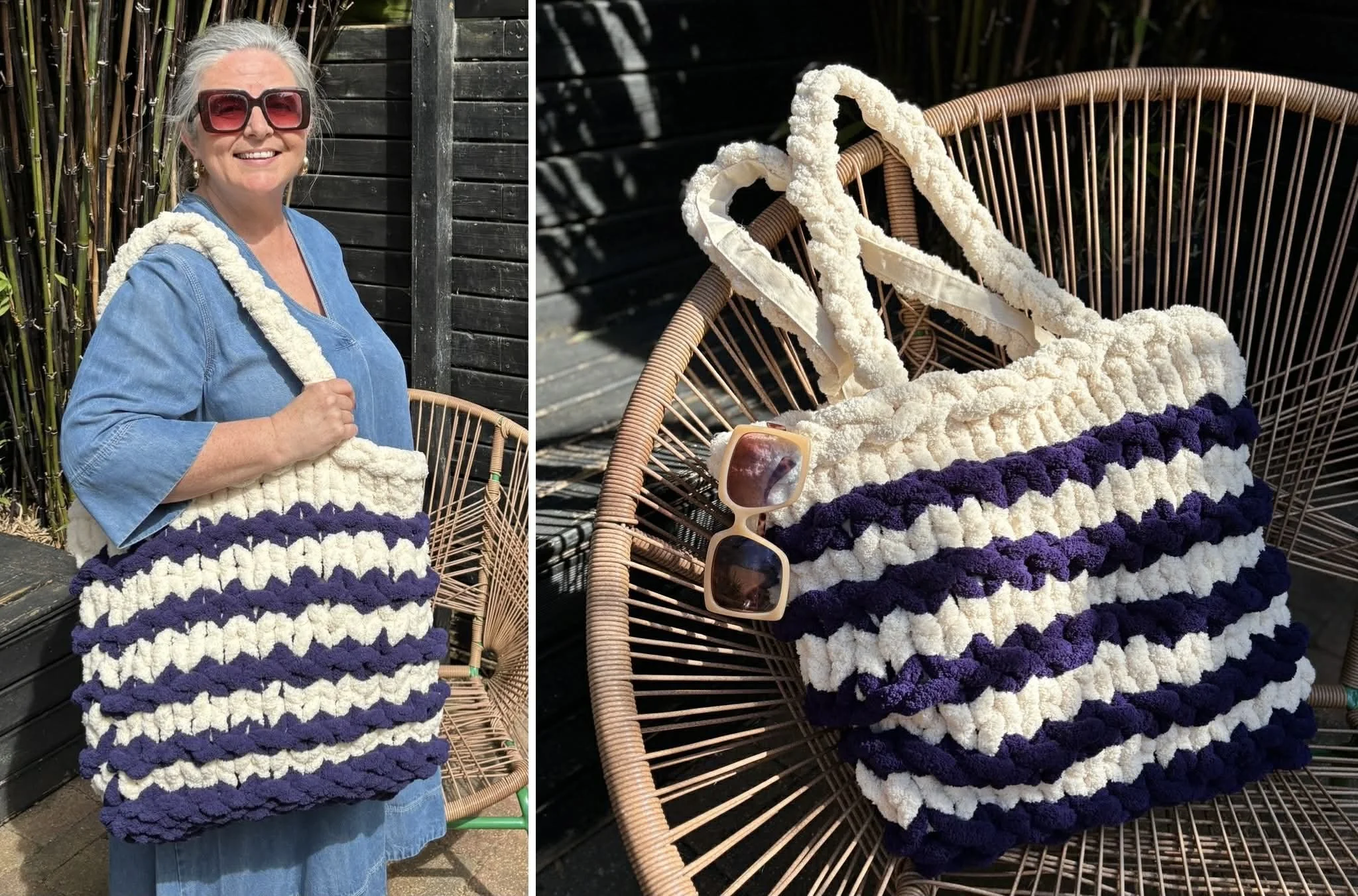 Made from a lightweight jumbo chenille yarn, this bag can also double up as a cosy cushion, whilst sunbathing on your sun lounger!